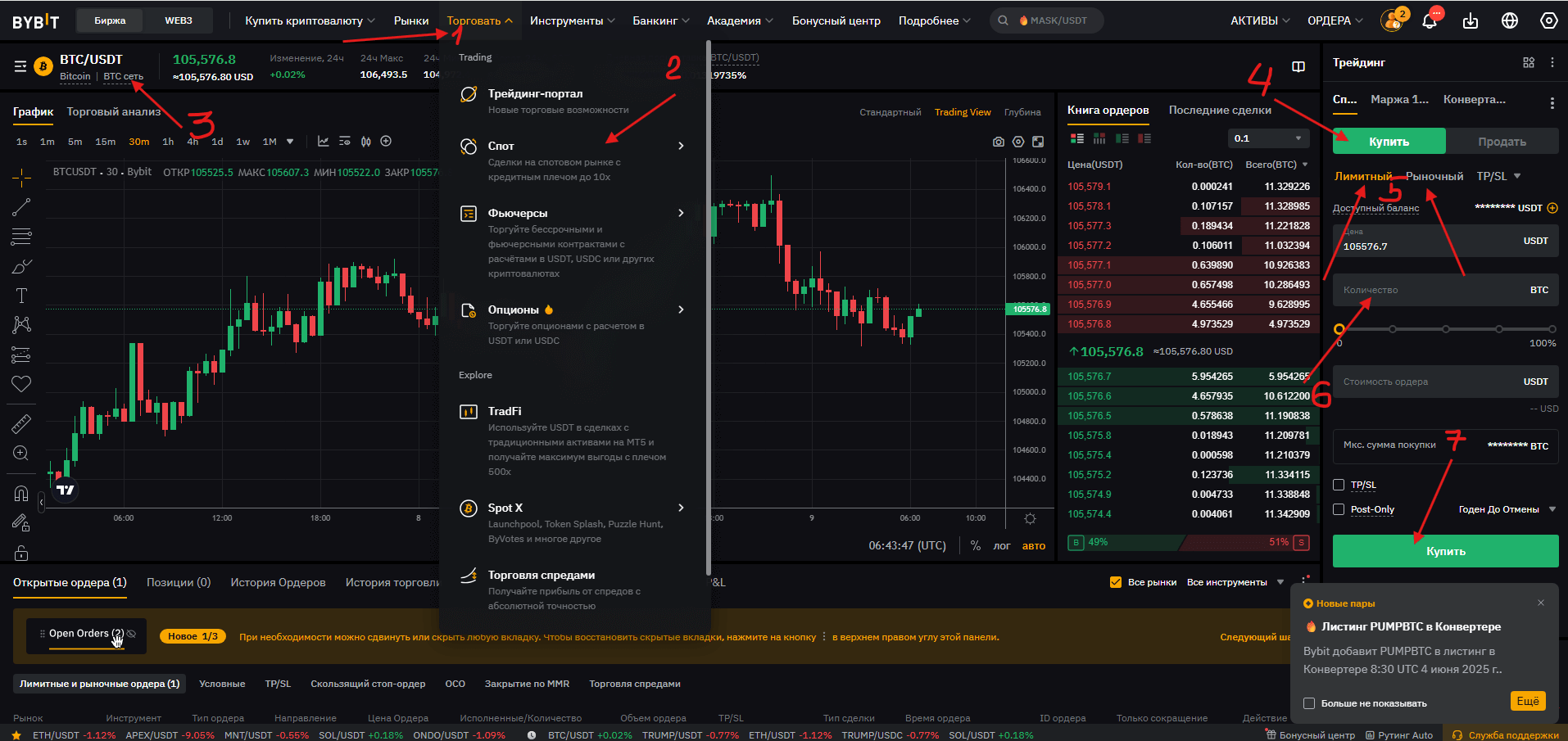 - Затем выбрать ордер, например, рыночный, лимитный, стоп-ордер