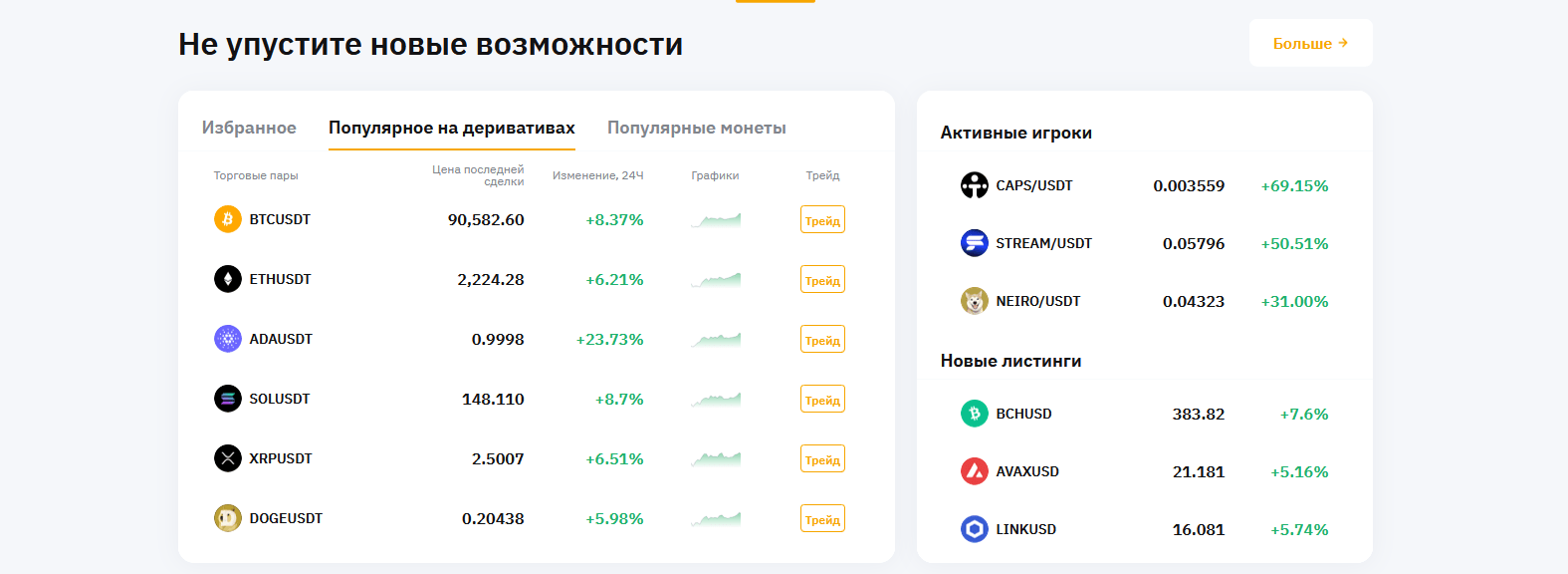 MEXC, в свою очередь, известна своими самыми низкими комиссиями относительно других популярных бирж и большим количеством доступных токенов. Она предлагает не только фьючерсную и спотовую торговлю, но и множество инструментов для дохода пассивного. Отлично подходит тем, кто торгует альткоинами на ранних стадиях. В отличие от Bybit, MEXC делает акцент на листинге перспективных и новых криптовалют, что привлекает инвесторов, ищущих «скрытые жемчужины» среди альткоинов.