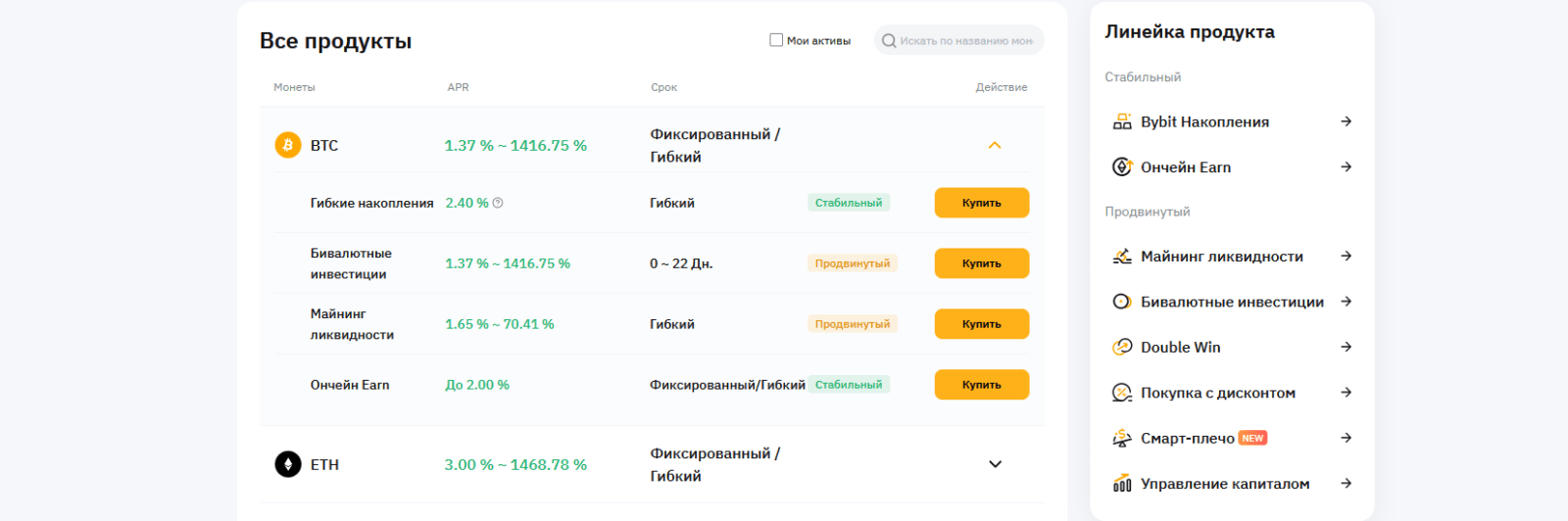 - Bybit Earn — здесь можно стейкать популярные токены (BTC, ETH, USDT), участвовать в гибких депозитах с начислением процентов и инвестировать в DeFi-программы.