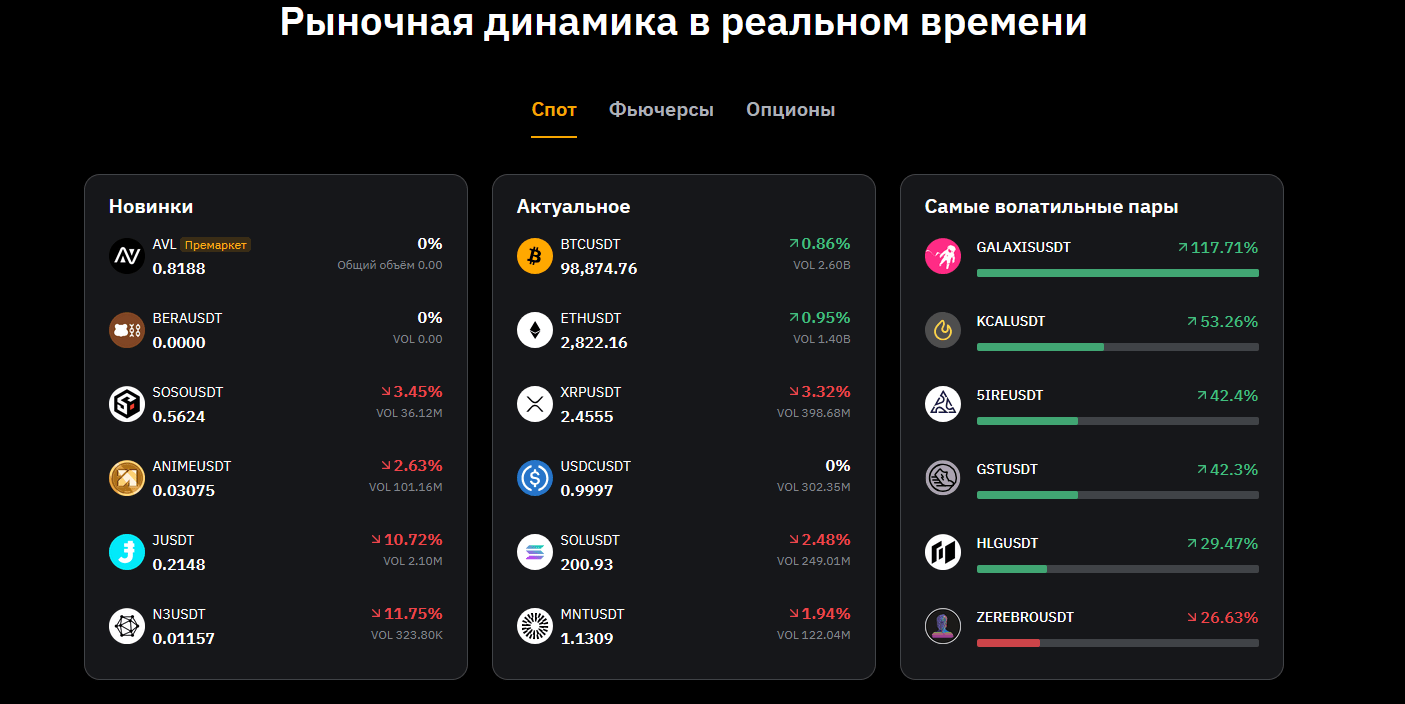 Биржа предлагает разнообразный набор инструментов, включающий спотовую и деривативную торговлю. Платформа ориентирована на высокую скорость исполнения ордеров, гибкость в выборе торговых стратегий и обладает глубокой ликвидностью.