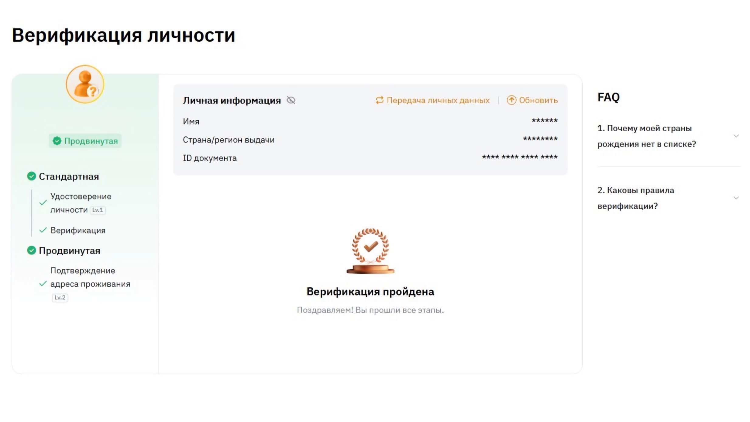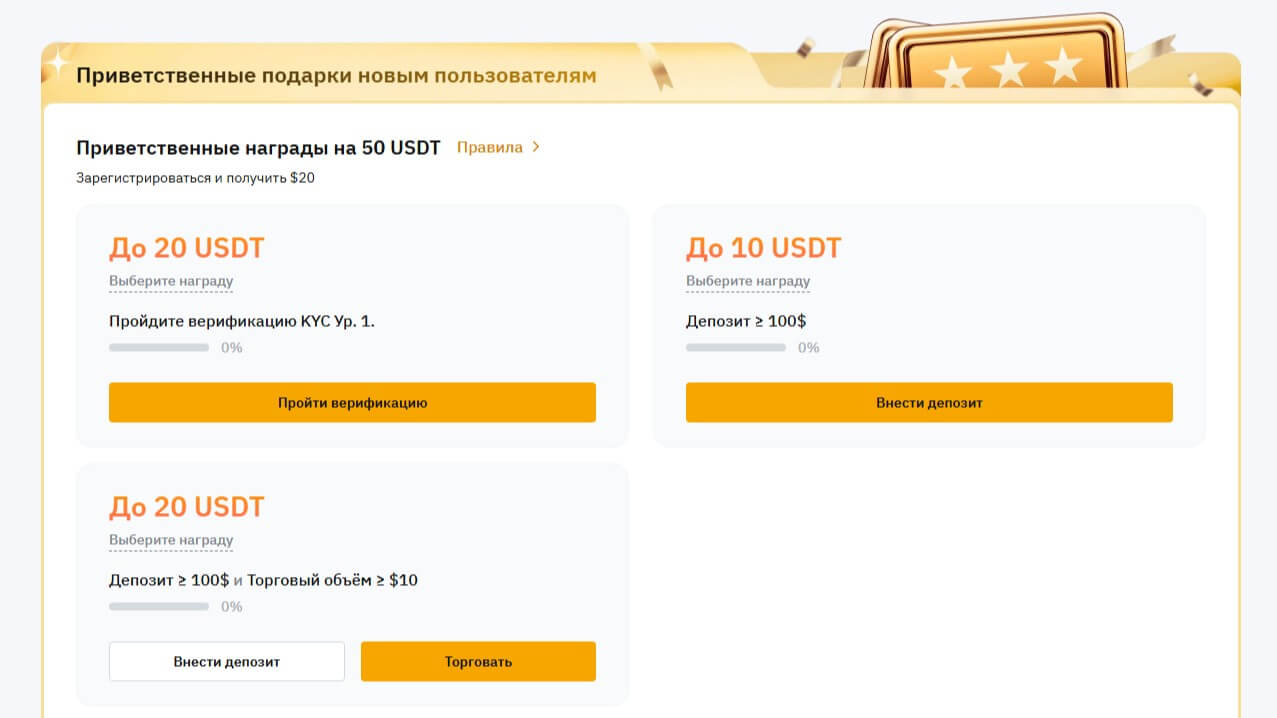 Для прохождения KYC требуется предъявить государственный документ, удостоверяющий личность, а также сделать селфи для подтверждения. Верифицированные пользователи получают доступ к расширенным лимитам вывода средств, участвуют в эксклюзивных программах лояльности и могут использовать все доступные функции биржи.