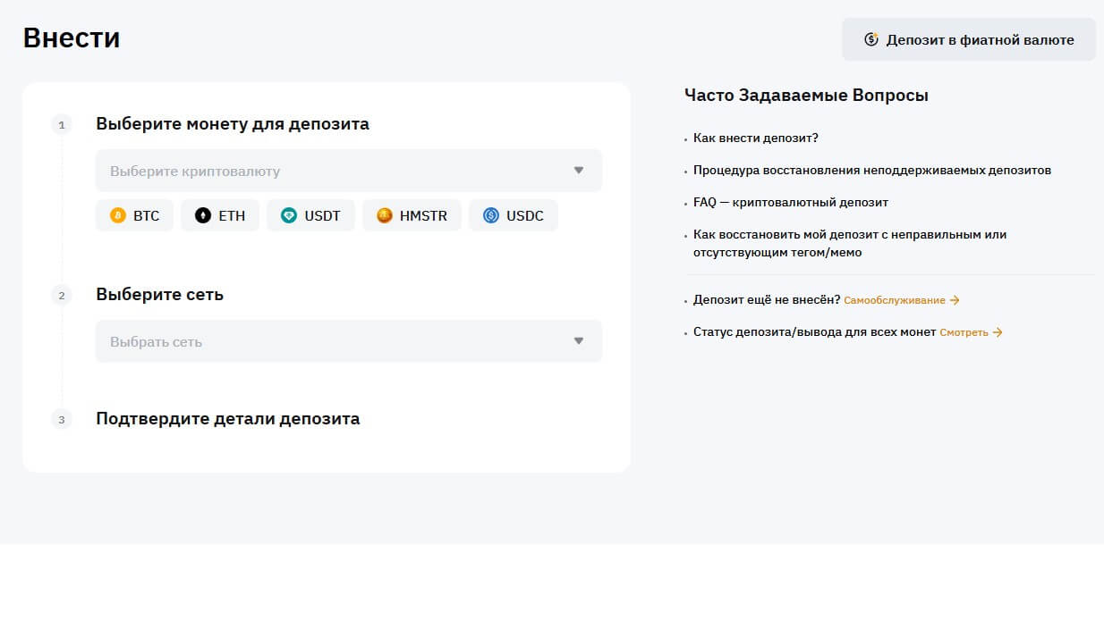 Пополнение счета возможно через несколько методов: криптовалютные переводы, покупка криптовалюты с помощью банковских карт и интеграция с фиатными платежными шлюзами. Депозиты в криптовалюте обрабатываются моментально, в то время как фиатные переводы могут занять некоторое время, это зачастую зависит от способа оплаты.