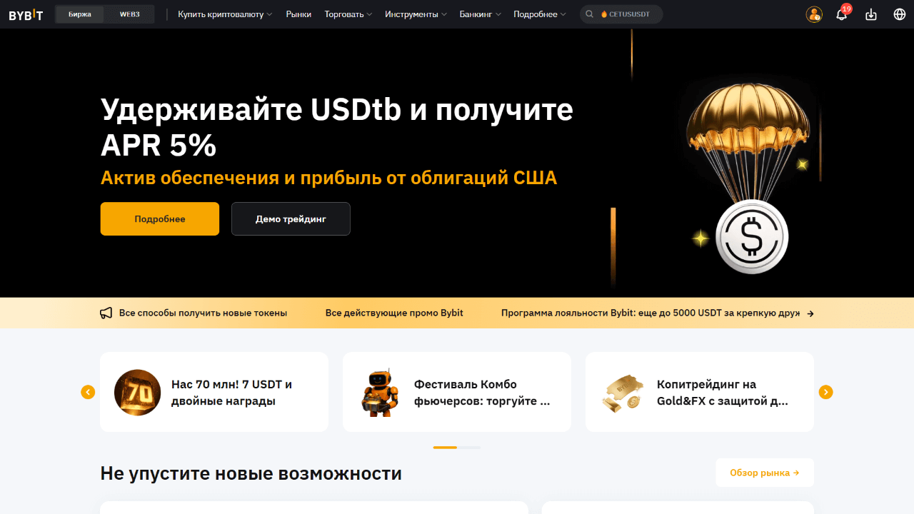 В нише спотовой торговли Bybit, у пользователей есть выбор из множества криптопар, среди которых находятся такие активы, как BTC, ETH и USDT, а также десятки других валют с хорошей ликвидностью и приемлемыми комиссиями. Можно использовать лимитные, рыночные и условные ордера для управления сделками, а для опытных пользователей доступны продвинутые инструменты технического анализа и возможность применения API для алгоритмической торговли.