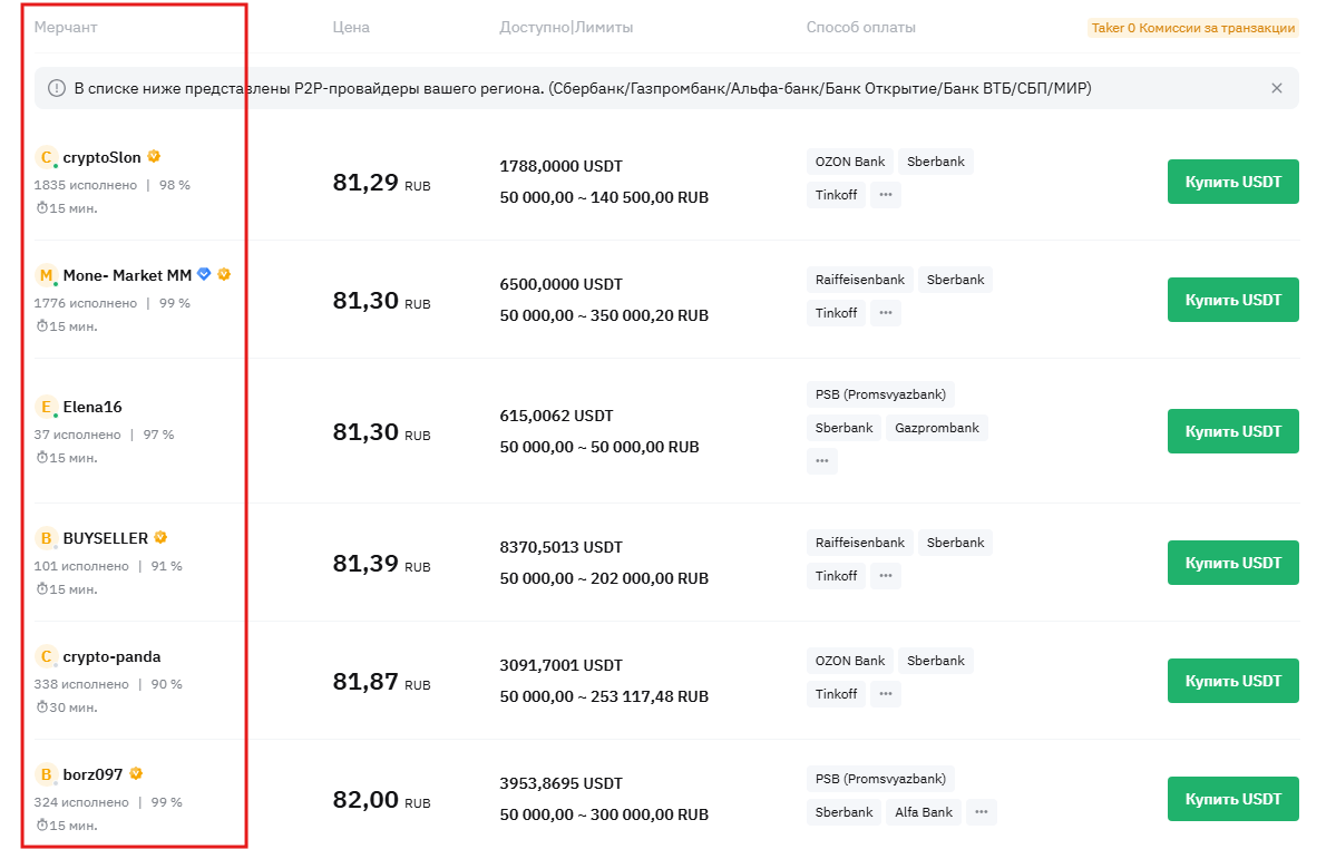 - Далее смотрим таблицу. В первом столбце находятся мерчанты, выбирая подходящий вариант по стоимости, можно просматривать информацию о владельцах (нажмите на логин), чтобы понять, насколько они надежны и сразу обратить внимание на выставленный продавцом тайминг сделки;