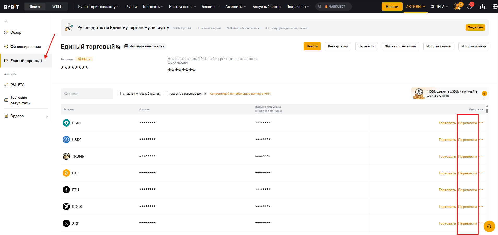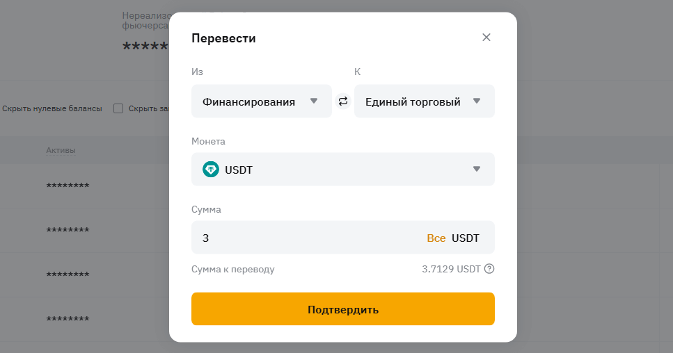 Приобретенные криптовалюты хранятся на «Аккаунте финансирования», откуда их можно перевести в «Единый торговый аккаунт» для последующего использования в спотовой или деривативной торговле.
