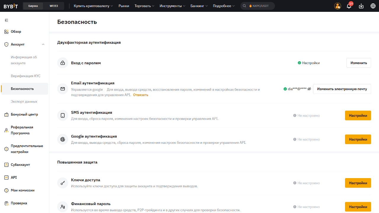 - После регистрации следует обеспечить защиту аккаунта, отметив в настройках 2FA, антифишинговые коды и прочие функции, которые предложит биржа.
