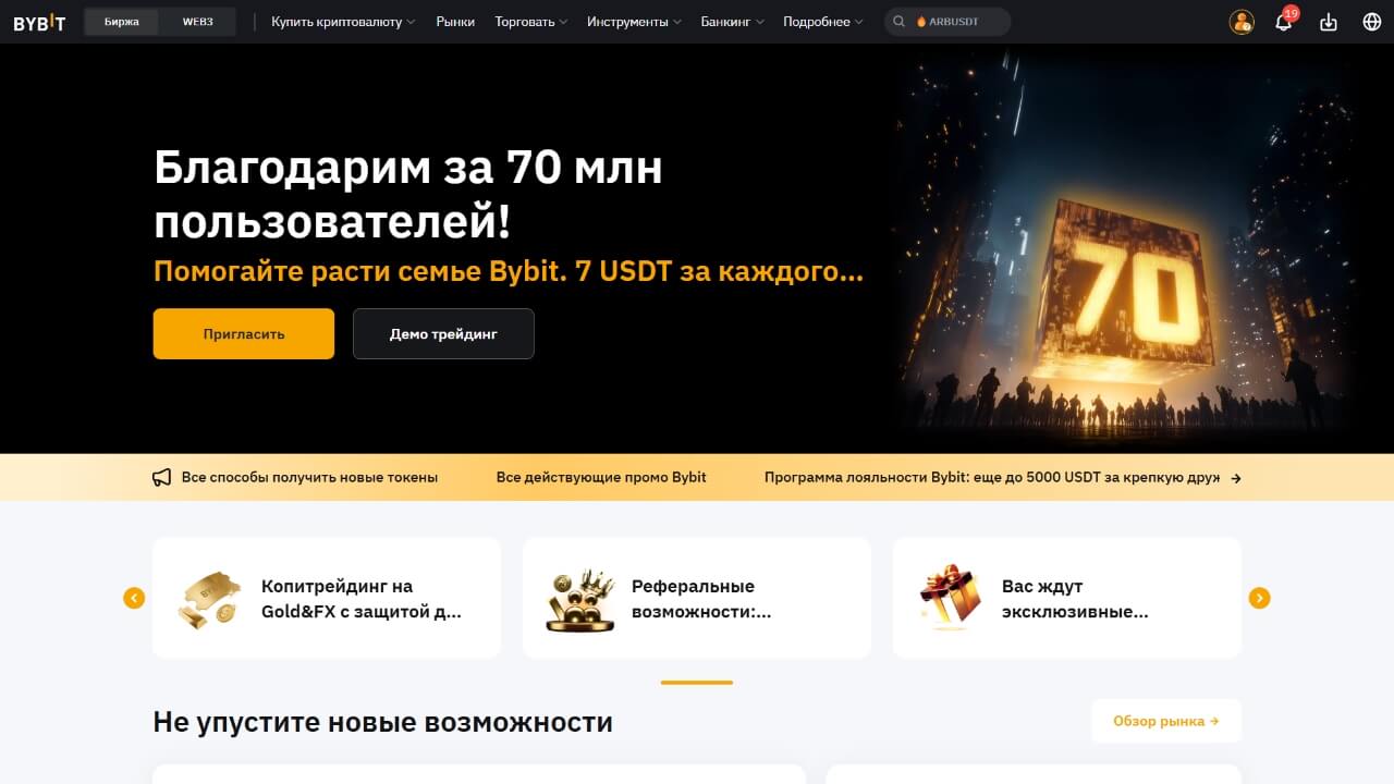 Bybit — известная криптобиржа, специализирующаяся на деривативах, предлагает продвинутые функции для трейдеров, включая возможность маржинальной торговли и фьючерсов. Поддерживает русский язык, что делает её удобной для россиян. Предлагает P2P-торговлю, при помощи которой можно напрямую обменивать свои рубли на криптовалюту, что облегчает процесс ввода/вывода средств. Комиссии на бирже относительно низкие, что является дополнительным плюсом.