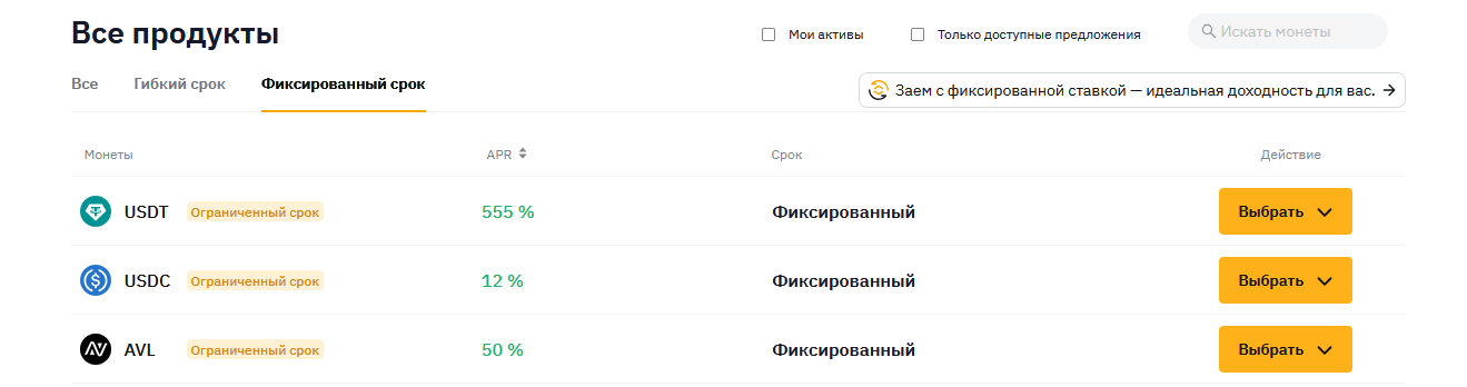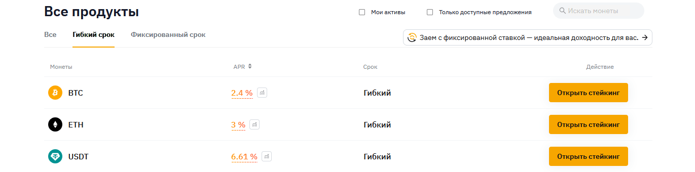 - Ознакомьтесь с доступными продуктами: гибкие накопления, фиксированные накопления, стейкинг, бивалютные инвестиции и другие.