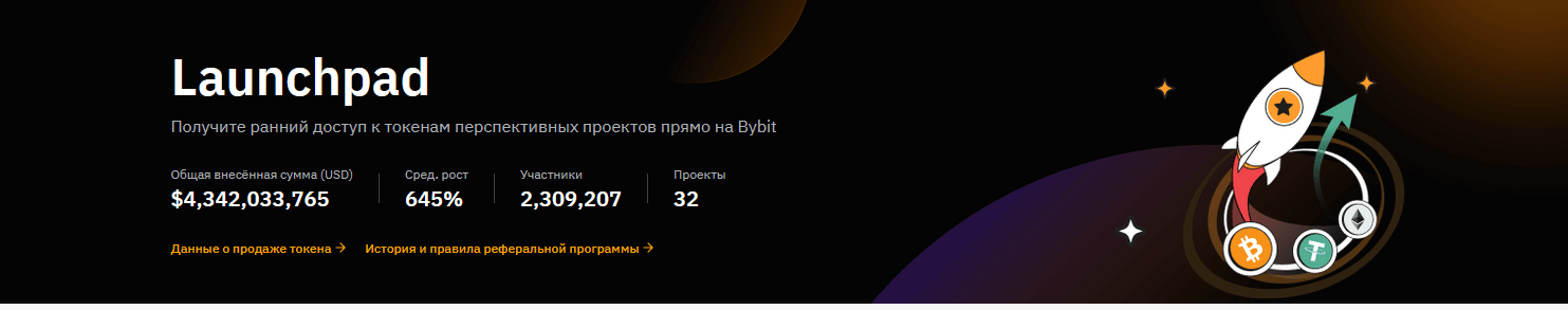 Bybit Launchpad — это платформа для раннего доступа к новым токенам, где можно заработать, просто участвуя в распределении. Биржа предлагает возможность вложить свои USDT или BIT и получить новые перспективные монеты по цене листинга.