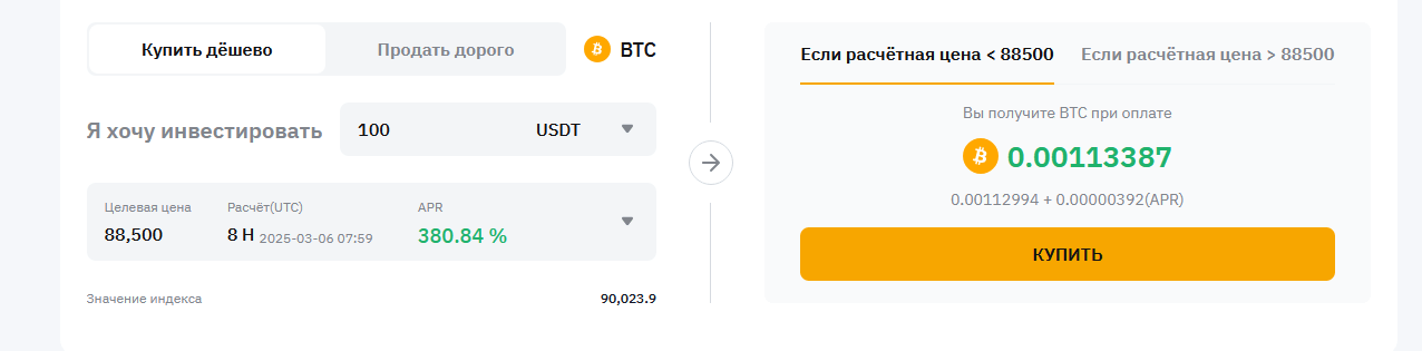 - Как работает: Инструмент совмещает особенности стейкинга и торговли. Пользователь выбирает два актива (например, BTC и USDT) и размещает депозит. В зависимости от рыночного курса в момент завершения периода, средства могут быть выплачены либо в одной, либо в другой валюте