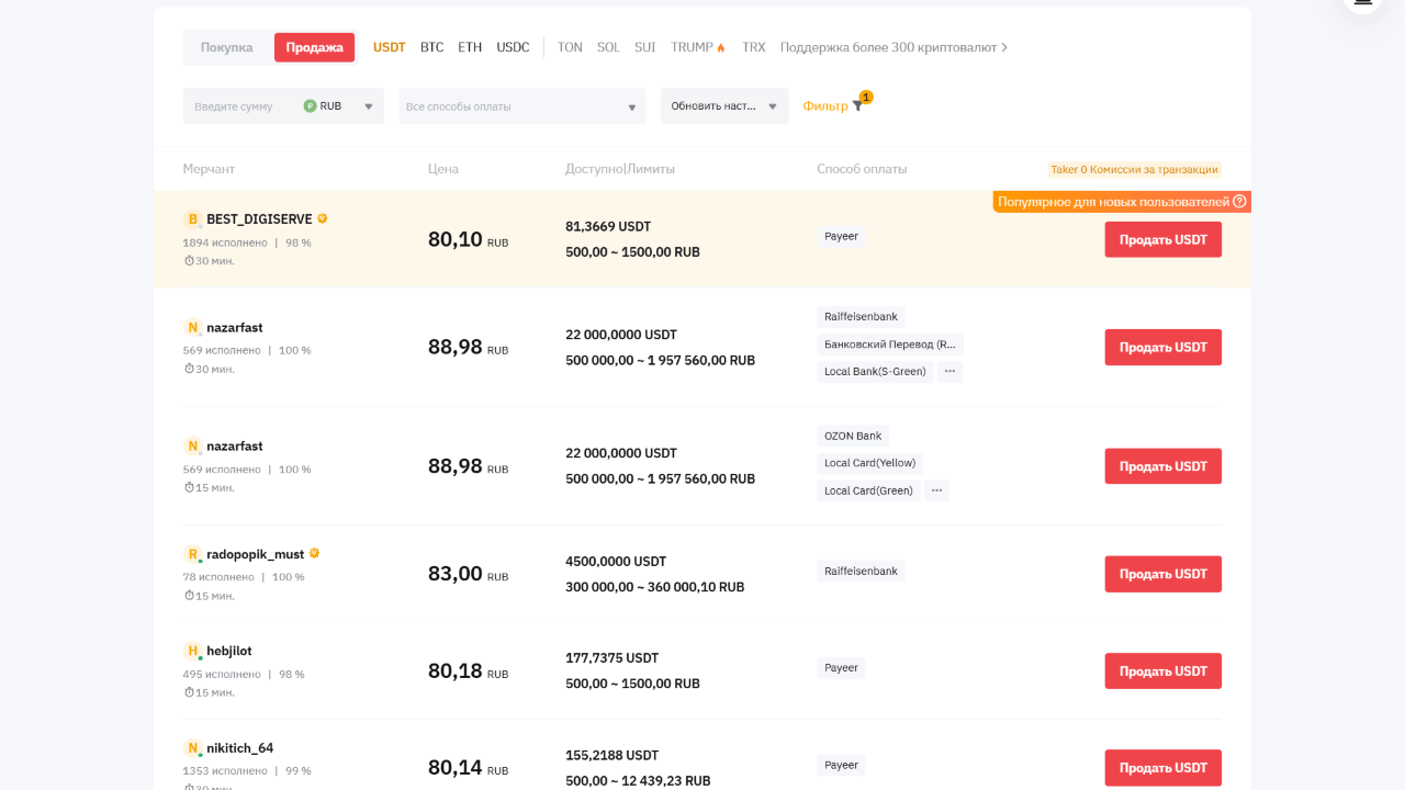 На пиринговой торговле можно покупать криптовалюты через p2p в виде BTC, ETH и стейблкоинов USDT. Выбор не сложный, тут зависит от предпочтений, но обычно крипту приобретают для торговли, спекуляций и стейкинга. USDT — стабильная валюта с минимальной волатильностью, так что он подходит в качестве платежного средства или для хранения.