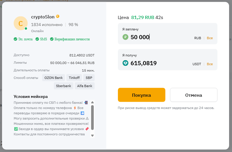 Если все устраивает, жмите кнопку «Покупка». Далее вы попадете в ордер. Оплатите заказ, следуя инструкциям (условиям сделки конкретного мейкера). Это может быть оплата на карту или по СБП, а также с использование платежных сервисов. Конкретно тот метод, который вы выбрали на первом шаге в p2p.