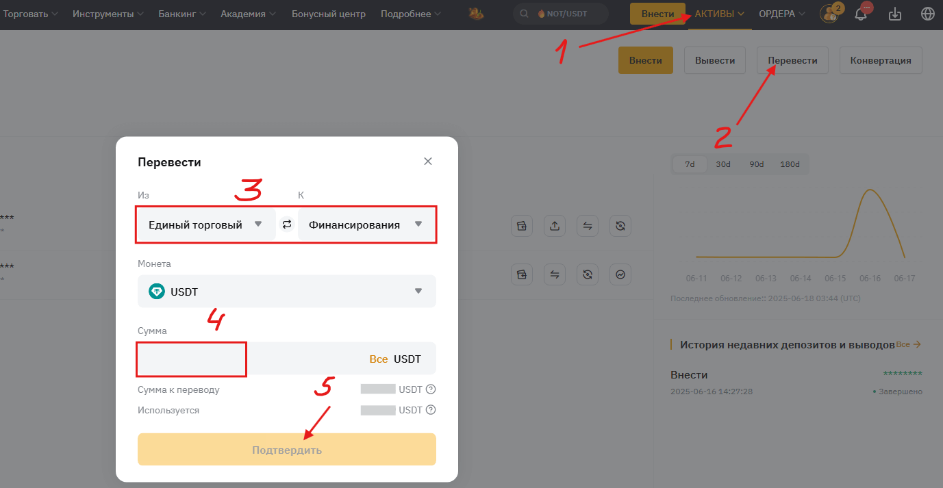 Пополните аккаунт финансирования, если у ваc криптовалюта на едином торговом аккаунте.