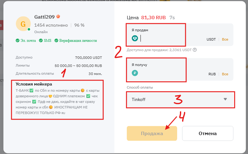 Подберите нужное объявление. В открывшемся окне ордера, прочтите условия мейкера (1), укажите сумму валюты или сумму рублей (2), выберите ранее добавленный способ оплаты (3) и нажмите «Продажа» (4).
