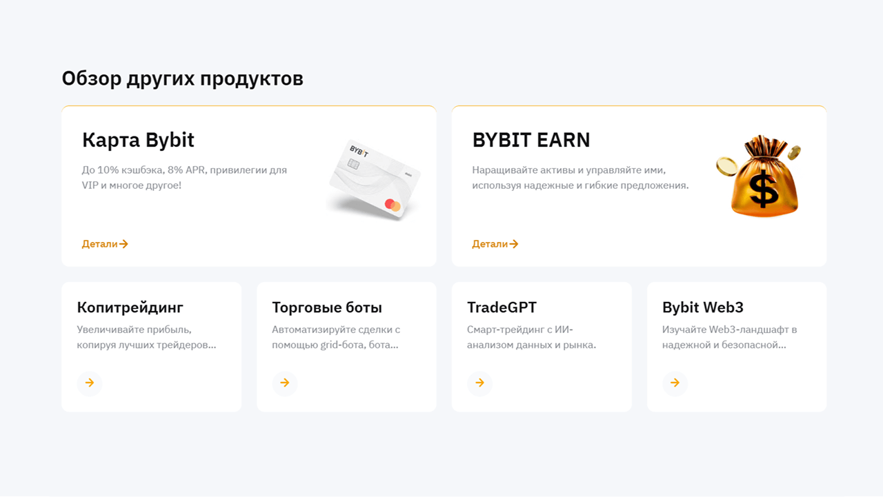 Bybit предлагает обширный ассортимент функций, сервисов и инструментов, необходимых для успешной торговли и инвестиций. Она подходит буквально всем, так что, стоит ее рассмотреть, если вам требуется надежная платформа для криптобизнеса. С учетом развития и востребованности цифровых активов, ее присутствие на рынке будет еще долго актуально и востребовано.