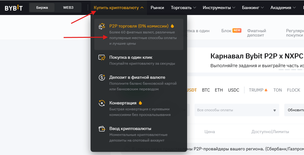 Раздел «Купить криптовалюту» → P2P Торговля и перейдите на P2P-площадку.