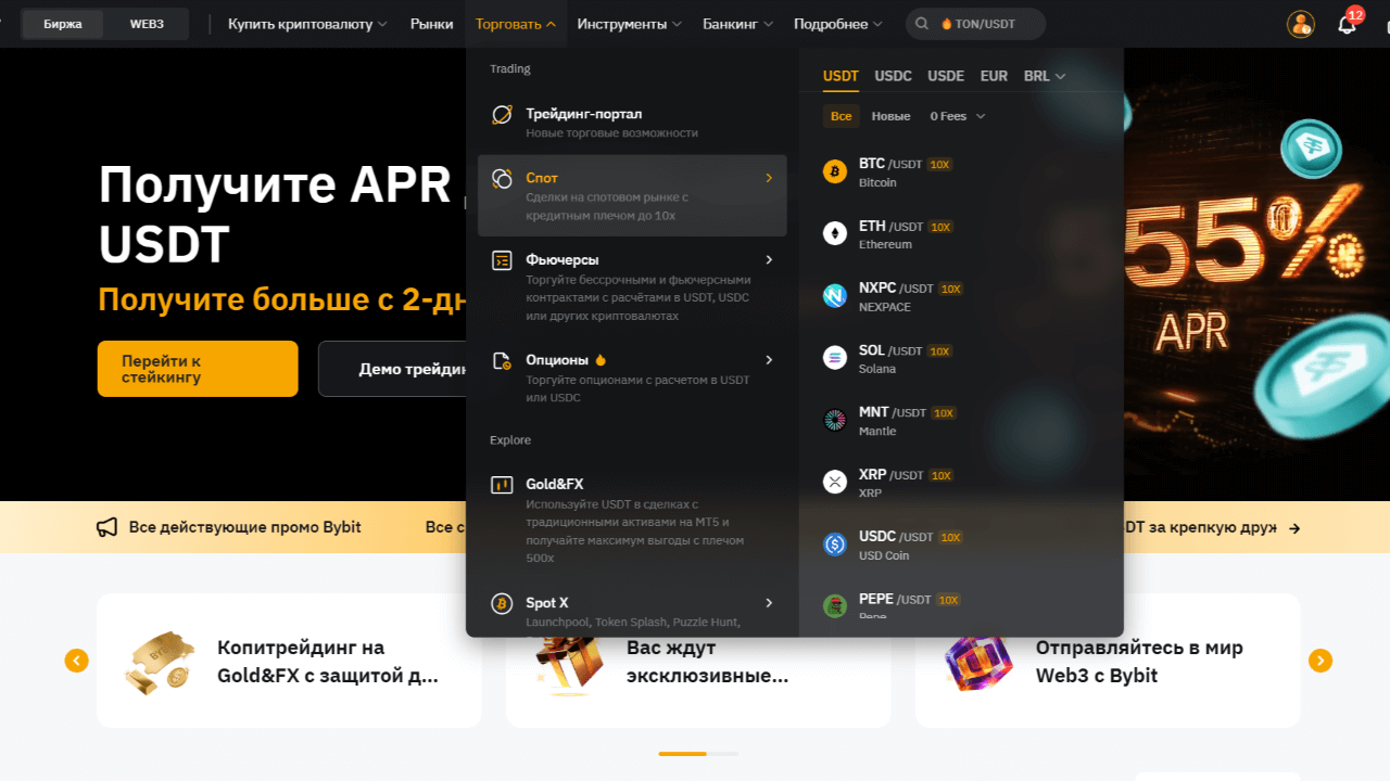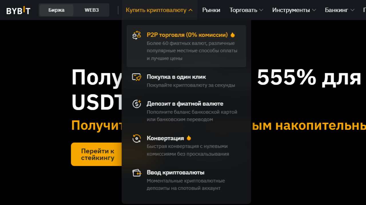 Что касается рынков, помимо знаменитых деривативов байбит, здесь есть классика, вроде спота, инвестиционные проекты Earn, децентрализованная площадка P2P, Web3, свопы, NFT, MT5.