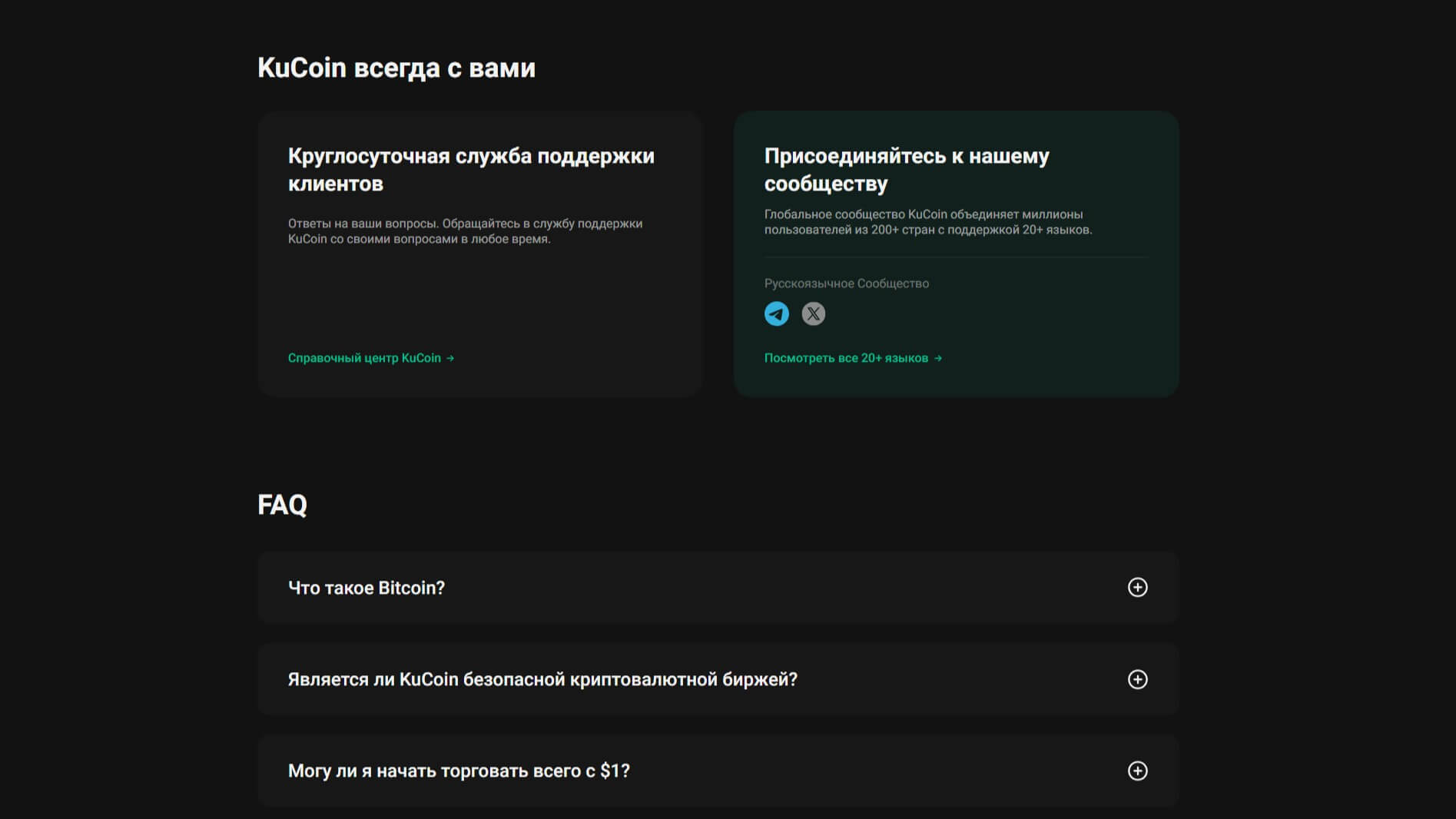 KuCoin предлагает 24/7 консультации от службы поддержки. Они доступны как в чате на самом ресурсе, так и в системе тикетов, электронной почте. Однако если вопрос популярен, ответ на него можно легко найти самостоятельно в образовательной библиотеке биржи. Кроме того, оперативная поддержка есть в соцсетях, а для VIP-клиентов и продуктивных в торговле пользователей доступны персонализированные услуги специалистов.