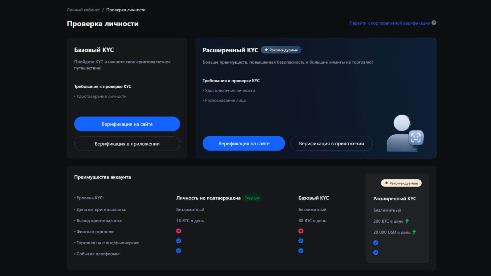 KYC-верификация необязательна, можно торговать и в анонимном статусе, но для увеличения лимитов на вывод средств и участия в специальных биржевых программах может потребоваться.