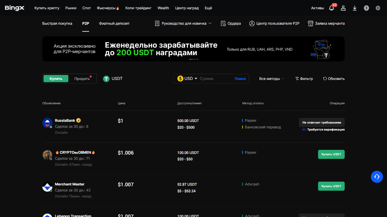 BingX на P2P очень удобна в использовании, здесь простой интерфейс, огромный выбор банков, с которых можно за рубли покупать стейблкоин USDT. Почта Банк, ПСБ, Росбанк, ВТБ, Россельхозбанк, Сбер и прочие национальные платежные системы России здесь работают без сбоев. Если не устраивают банки, есть поддержка Киви-кошелька. Торговые сборы, как правило, находятся на конкурентоспособном уровне, а еще BingX славится своими акциями и бонусами, которые привлекают новых трейдеров.