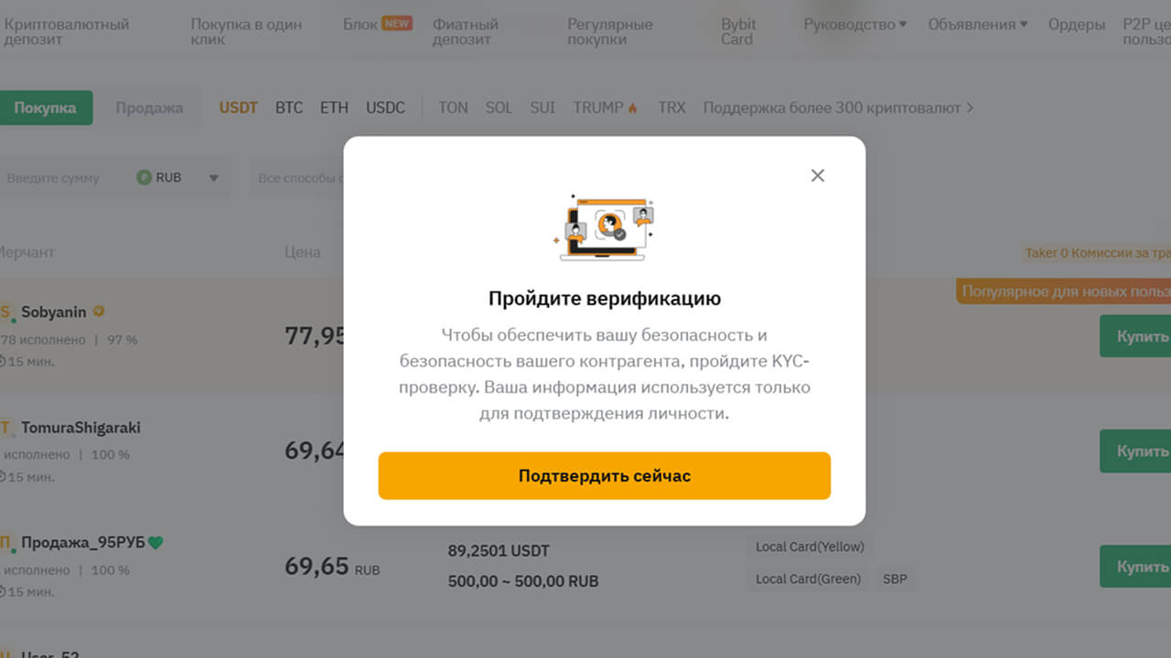 Bybit предоставляет одну из лучших площадок P2P обмена криптовалютами для россиян, за счет поддержки национальной валюты и основных банков, таких как БКС, Сбер, ПСБ, Т-Банк, Русский стандарт и так далее. Можно использовать переводы, СБП. Поддерживает стейблкоины USDT, USDC и более 300 криптовалют, включая BTC, ETH. На бирже адекватные комиссии, множество акций и интересных заданий, за выполнение которых можно получать вознаграждения.
