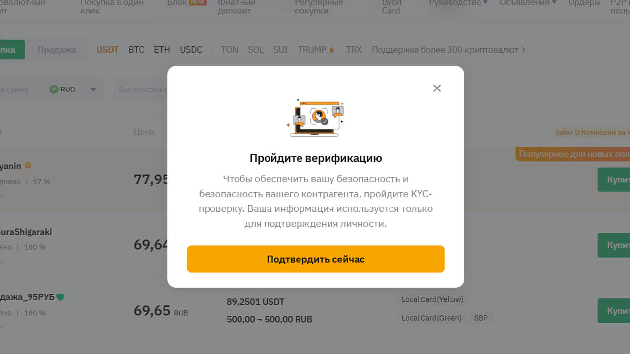 Торговать на P2P через Bybit без верификации не получится, проверку личности пройти придется в обязательном порядке.