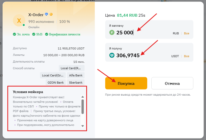 Укажите сумму в фиатах, которую планируете вложить или количество монет, которое желаете приобрести. Ознакомьтесь с условиями мейкера. Обратите внимание на условия по переводу рублей, так как в настоящее время практически все предпочитают переводы через СБП. Если вас условия устраивают, кликнете на «Покупка»