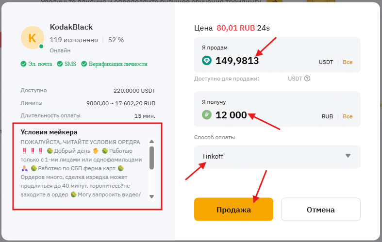 Чтобы реализовать валюту с помощью P2P-блока, выберите мерчанта и кликните «Продать USDT». Введите количество валют, которое желаете реализовать или сумму фиатных средств, которую хотите за монеты получить. Выберите ранее добавленный способ оплаты, однако в настоящее время это чисто формальность и рубли за монеты переводят в выбранный банк через СБП. Поэтому очень важно внимательно прочитать условия мейкера, где он расписывает как переводит рубли и какие есть нюансы во взаимодействии с ним. Если условия вам не подходят, закройте окно и выберите другого мерчанта. Если всё устраивает, то нажмите «Продажа».