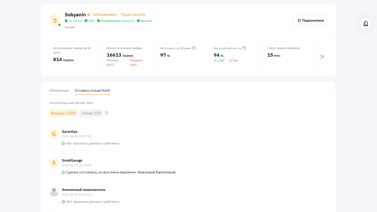 Найдя нужное предложение, следует проверить рейтинг продавца, который формируется на основе предыдущих сделок, а также почитать отзывы о нем. Важно также обратить внимание на скорость его ответов на запросы. Желательно, чтобы продавец оперативно реагировал, так как это ускорит сделку, что важно в условиях высокой волатильности.