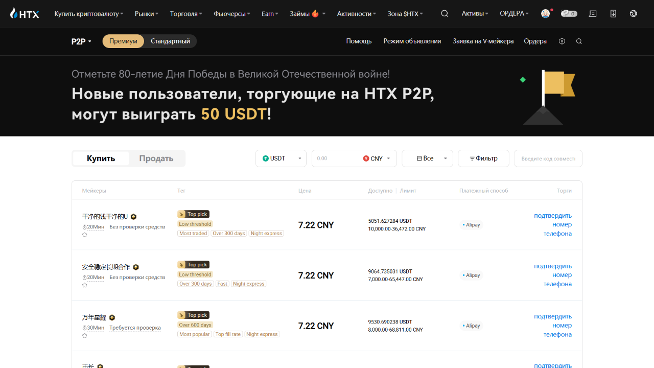 - HTX (ранее Huobi) P2P работает с русскими фиатами, предлагает удобные условия торговли, тем не менее скорость выполнения ордеров может быть ниже, чем у Bybit. Комиссии также варьируются, хотя зачастую пользоваться HTX может быть немного дороже, особенно для новичков