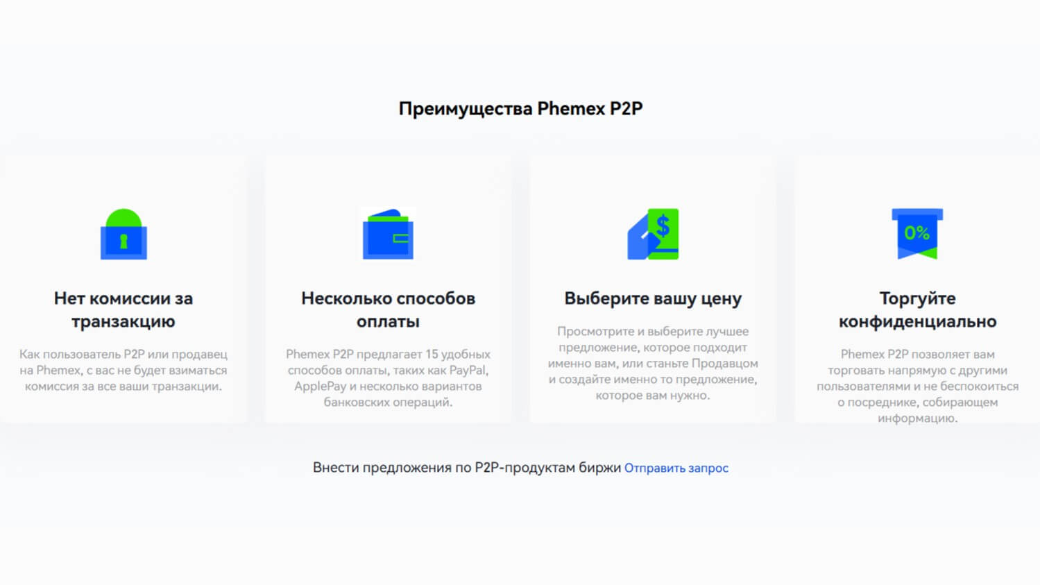 P2P на Phemex стандартный, его функционал предназначен для сделок по купле-продаже активов между пользователями без посредников, друг у друга. В преимуществах — сниженные комиссионные издержки, более комфортный процесс совершения сделок и встроенная система эскроу для обеспечения защиты.