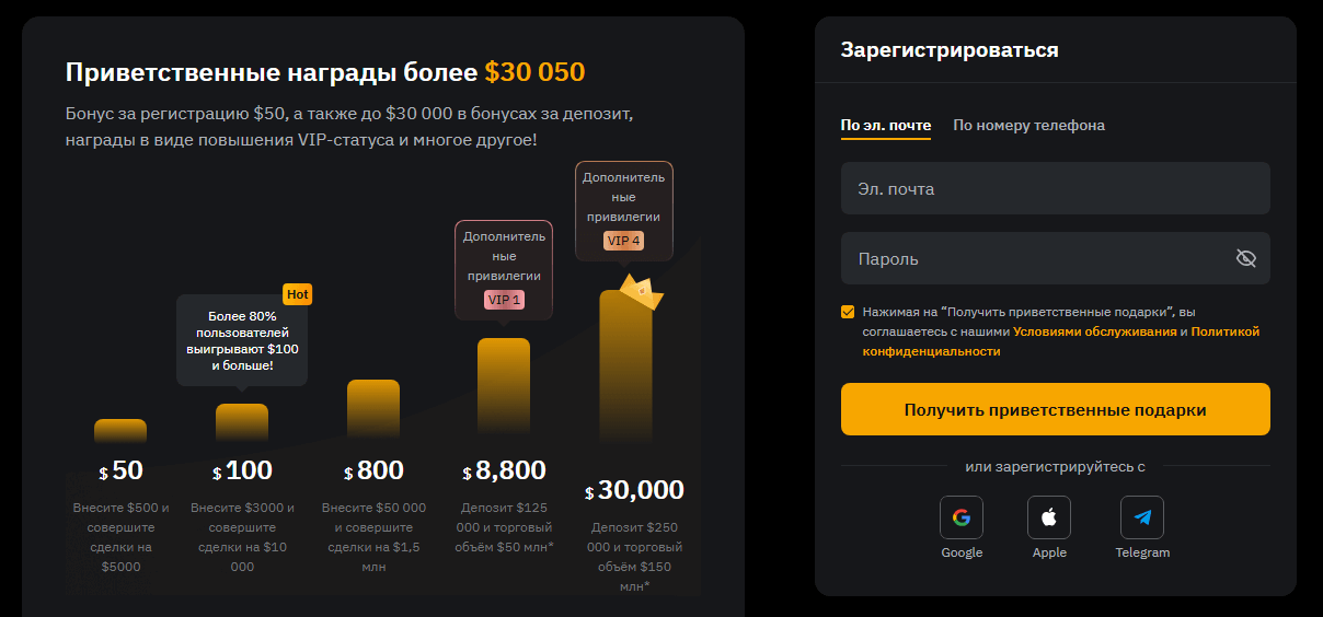 OKX известна мощным функционалом, включающим в себя множество инвестиционных инструментов. А еще здесь низкие комиссии с возможностью снижения тарифов. Это делает ее привлекательной для индивидуальных и институциональных трейдеров, а также позволяет оптимизировать издержки на торговлю.