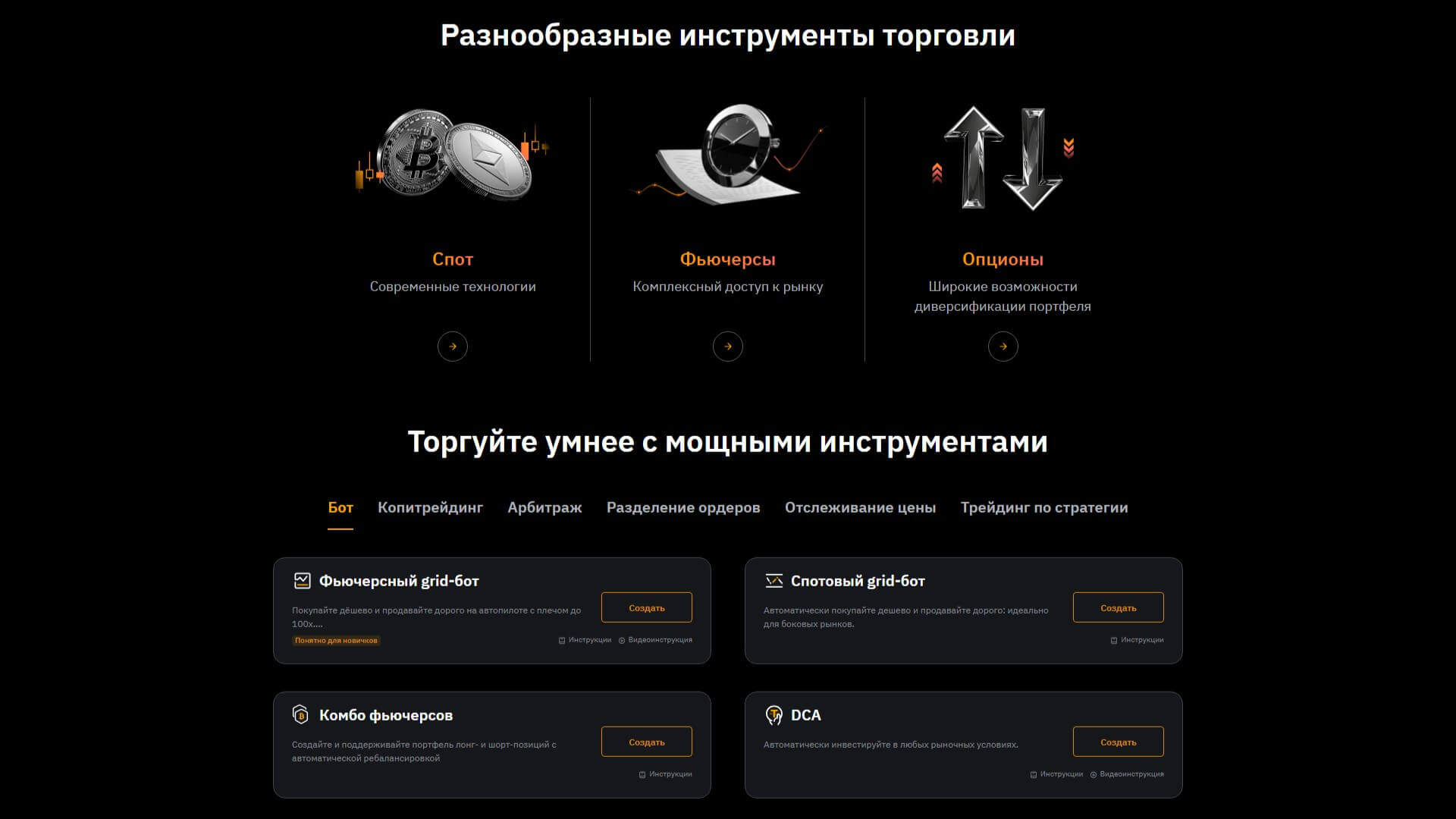Биржа предлагает разнообразный набор инструментов, включающий спотовую и деривативную торговлю. Платформа ориентирована на высокую скорость исполнения ордеров, гибкость в выборе торговых стратегий и обладает глубокой ликвидностью.