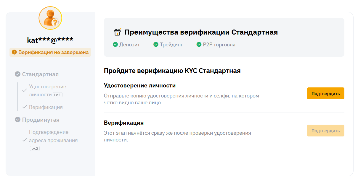 Для доступа ко всем торговым функциям нужно пройти KYC. Зайдите в раздел «Профиль» и следуя инструкциям предоставьте необходимые для верификации документы.