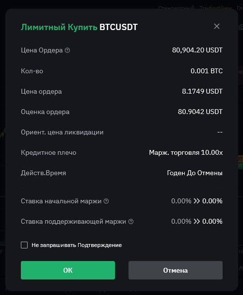 После выбора режима маржи укажите желаемый уровень плеча. Например, вы можете выбрать 10x или 20x, в зависимости от ваших предпочтений и уровня возможного риска. Помните, чем выше кредитное тем с большими рисками оно связано. Затем установите цену ордера — для лимитного ордера укажите цену. Наконец, укажите количество контрактов, которые вы хотите продать или купить.