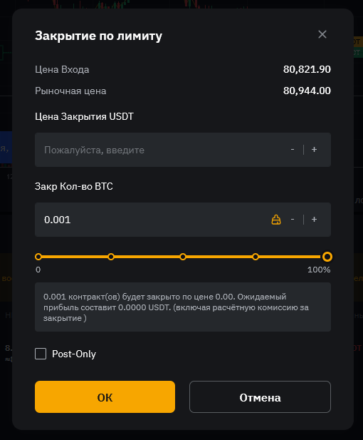 - Закрытие через лимитный ордер: Если вы хотите установить конкретную цену для закрытия позиции, выберите опцию лимитного ордера. Укажите желаемую цену и размер ордера, после чего нажмите «Закрыть». Ваша позиция будет закрыта, когда цена достигнет указанного вами уровня.