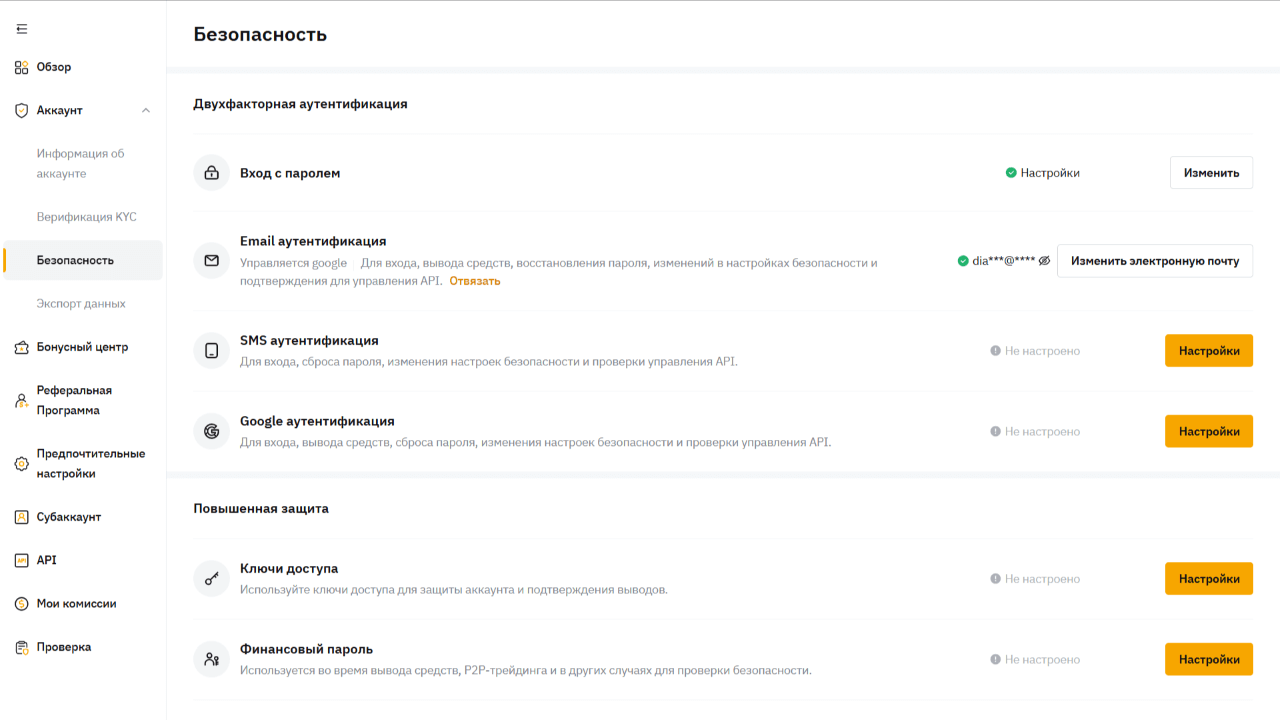 Затем нужно установить параметры защиты личной информации и средств, подключить 2FA, антифишинговые коды, белый список адресов и прочие настройки, по желанию.