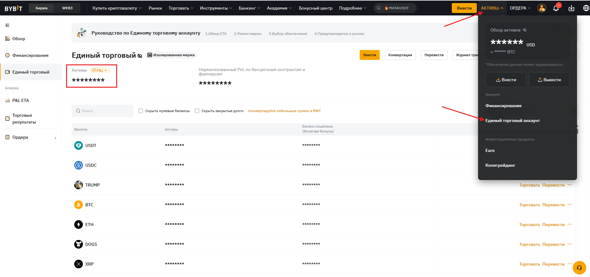 Затем заходим в спотовый кошелек (единый торговый аккаунт), чтобы проверить, зачислили ли покупку на счет.