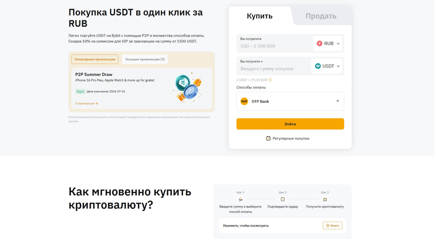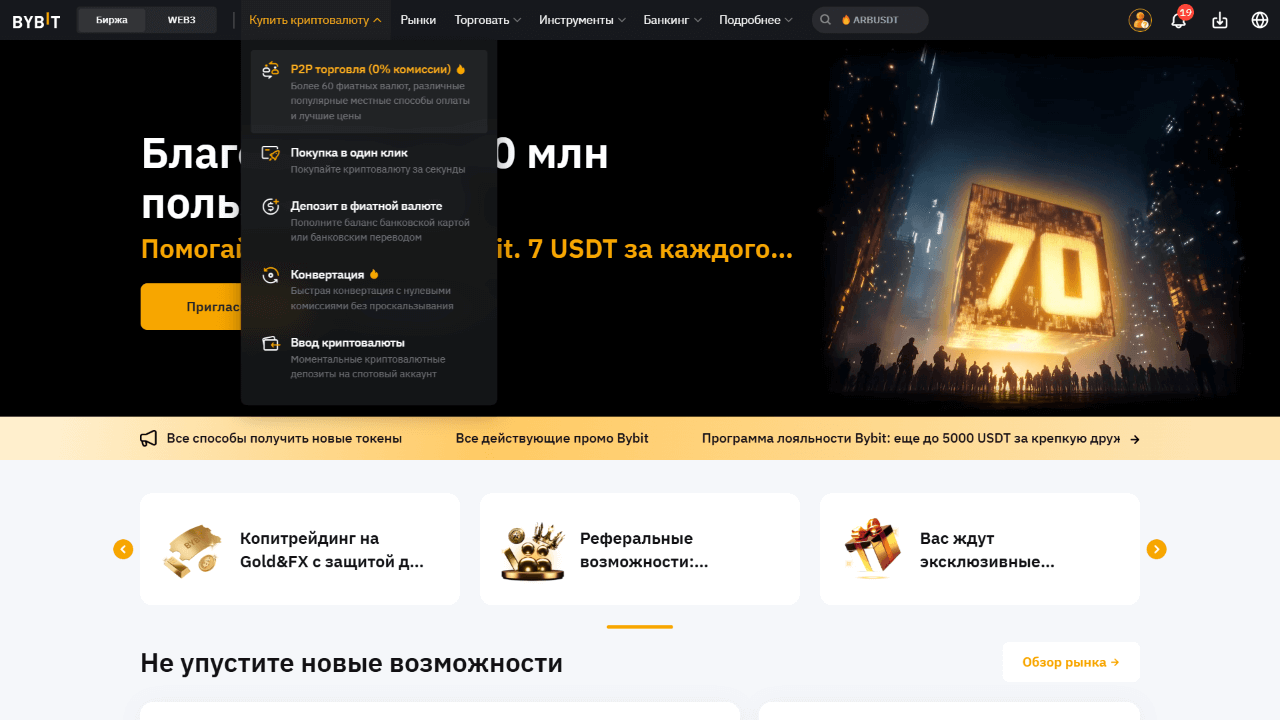 Bybit — известная криптобиржа, специализирующаяся на деривативах, предлагает продвинутые функции для трейдеров, включая возможность маржинальной торговли и фьючерсов. Поддерживает русский язык, что делает её удобной для россиян. Предлагает P2P-торговлю, при помощи которой можно напрямую обменивать свои рубли на криптовалюту, что облегчает процесс ввода/вывода средств. Комиссии на бирже относительно низкие, что является дополнительным плюсом.