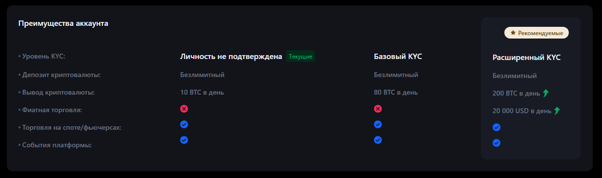 На большинстве бирж без верификации ограничен доступ к пиринговой и маржинальной торговле, недоступен вывод в крупных суммах и фиатах, перевод на банковские системы, априори одобряющих прозрачность поступлений.