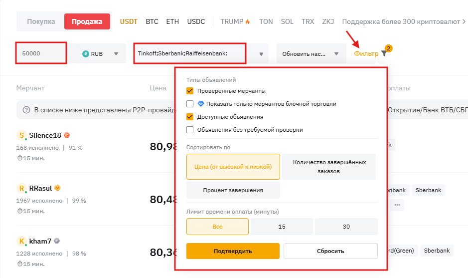 Подберите платежный метод, желаемый актив и фиатную валюту из списка доступных. Воспользуйтесь фильтром, это очень удобно для быстрого поиска подходящей цены, таймера, типа объявлений. Хотя можете посмотреть и все «меню», но так гораздо быстрее и можно отсеять то, что вам не подходит или вызывает подозрения.