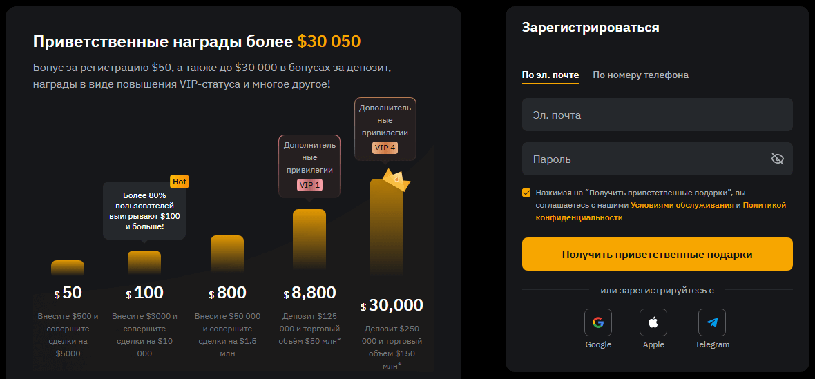 Тут есть простой совет. E-mail надежнее, чем номер телефона, поэтому лучше использовать именно его. А вот, что касаемо реферального кода, он поможет заработать приятные бонусы, поэтому смело вносите его, стартовый капитал в централизованных сегментах может весьма облегчить процесс торговли. Обязательно регистрируйтесь, нажав на кнопку ниже ⬇️, чтобы не упустить возможность получить приветственные бонусы и подарки.