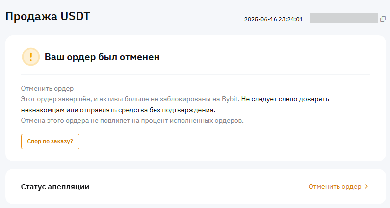 Если средства от покупателя не поступили, свяжитесь с ним через чат для выяснения причин либо подайте на «Спор по ордеру». При отсутствии оплаты со стороны покупателя в течение указанного времени, происходит автоматическая отмена ордера и возврат средств продавцу на Аккаунт финансирования.