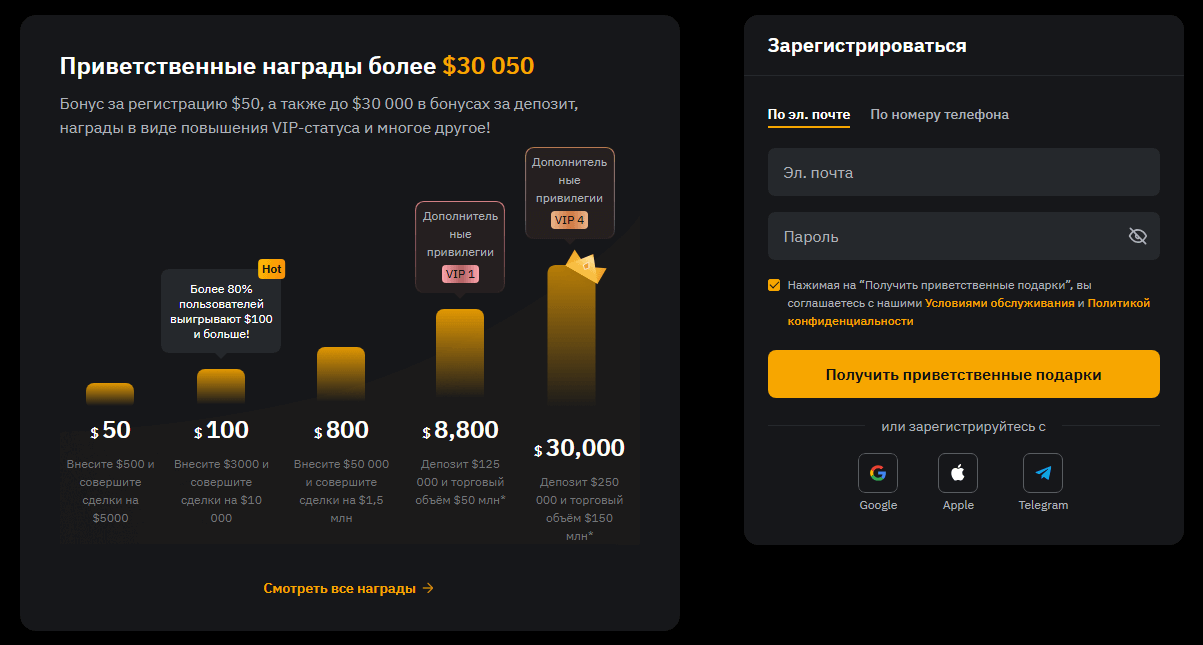 - $10 за депозит от $100. Можно выбрать бонус на деривативы или эйрдроп 0,0001 BTC на спот