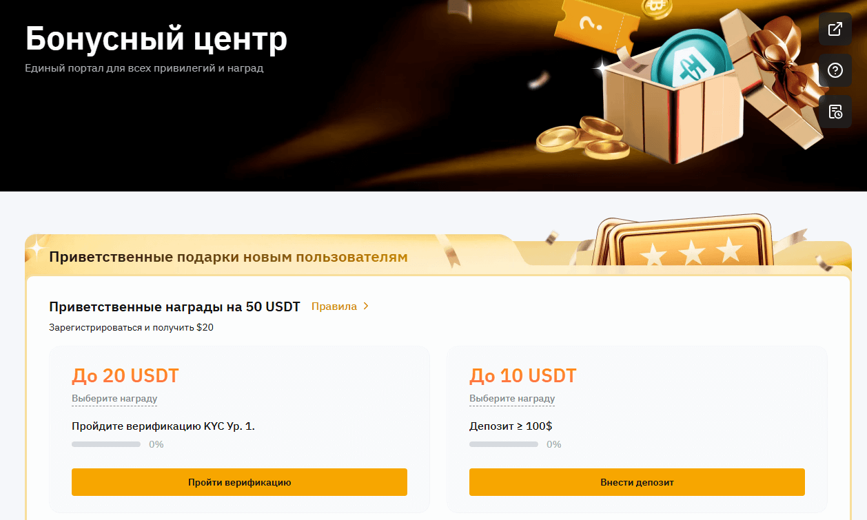После создания личного кабинета и прохождения базовой верификации будет начислен приветственный бонус за регистрацию Bybit в размере 20 долларов США.