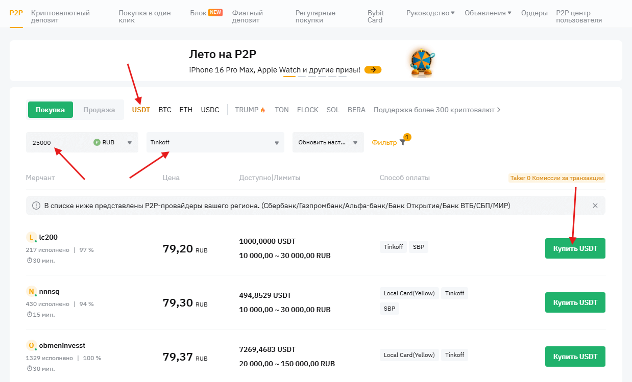 Выберите криптовалюту и способ оплаты, например, USDT через Сбербанк, Тинькофф, ЮMoney и другие. Выберите надёжного продавца с хорошим рейтингом и подходящим курсом.