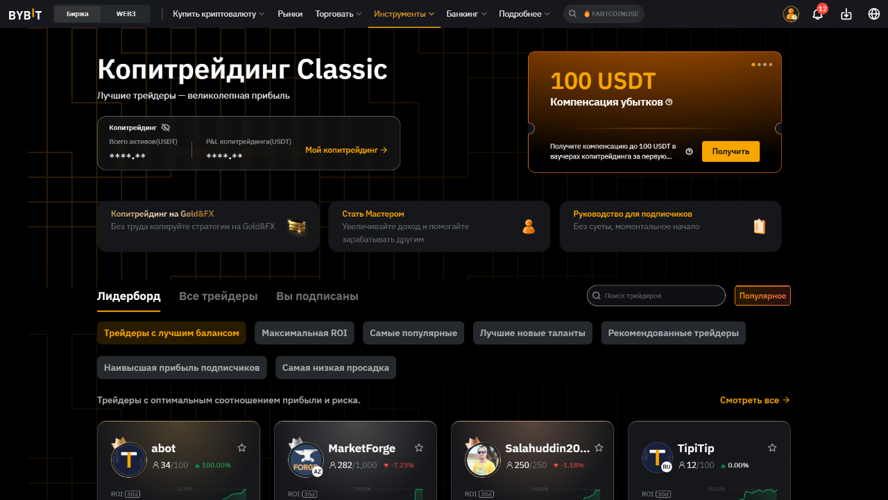 Что касается копитрейдинга Bybit — это еще один любопытный инструмент. Он будет интересен скорее новичкам, так предназначен для тех, кто пока еще не умеет создавать собственные стратегии. Суть в том, что можно копировать сделки успешных трейдеров, выбирая «донора» из специальной таблицы, где указаны достижения игроков на рынке. Опять-же, гарантии, что копипаст сработает нет никакой, даже самые опытные и крутые игроки могут ошибаться, а рынок не всегда предсказуем. Но в принципе, риски есть в любых финансовых сферах.
