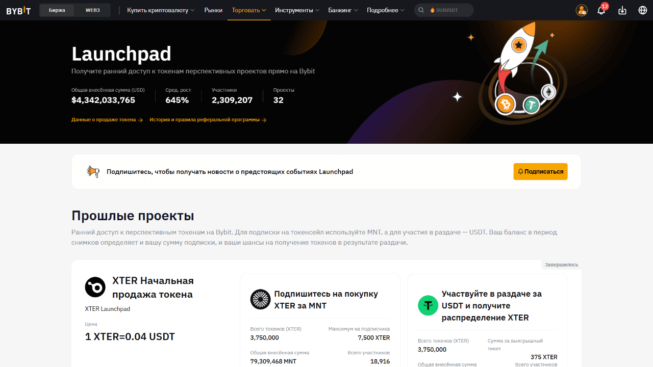 Что касается лаунчпадов Bybit, здесь также все по классике. Это мероприятия по запуску новых токенов и их первичному приобретению по сниженной цене. Конечно, это рискованно, но если токен удачно стартует, может принести неплохую прибыль. Главное, все тщательно изучить и рассчитать.