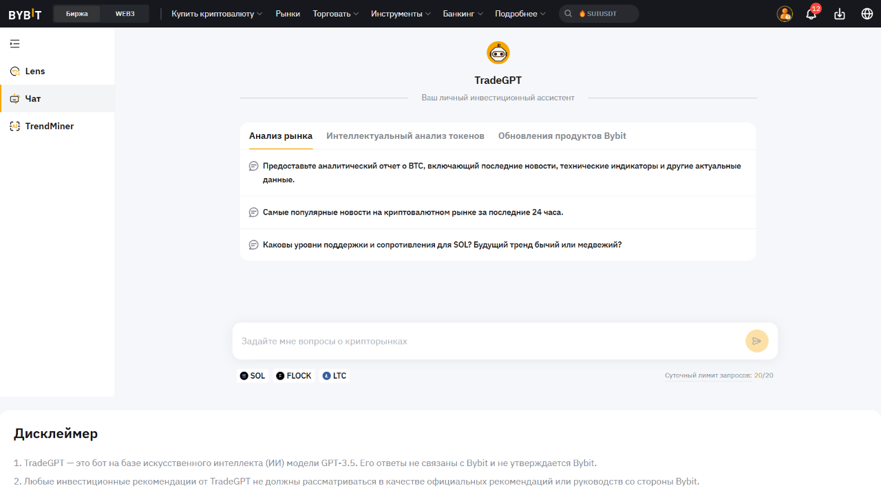 TradeGPT — бот версии GPT-3.5. Торговый инструмент криптобиржи, который используют в качестве анализатора и автоматической покупки при достижении рынком заданных параметров. Очень удобная функция, но стоит воспринимать его скорее как алгоритмический помощник. Разработчики платформы не советуют полностью полагаться на инвестиционные решения искусственного интеллекта и использовать его скорее как дополнительную проверку собственной стратегии.