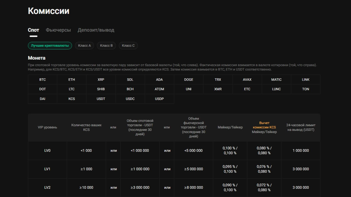 Базовая комиссия составляет 0,1% для спотового сегмента и 0,02% — 0,06% для фьючерсных сделок. Владельцы токенов KCS могут получать скидки, снижая расходы на сборы.